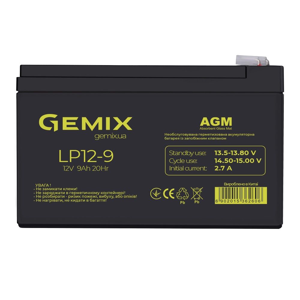 Свинцево-кислотна акумуляторна батарея Gemix LP12-9Ah. Скловолоконний абсорбуючий сепаратор (технологія AGM), вбирає електроліт і зменшує корозію електрода, ефективно збільшує термін служби і стійкість батарей. Батареї переносять перерозряд, перезаряд, вібрацію і удари, а також допускають тривале зберігання. Використання товстих і важких свинцево-кальцієвих пластин дозволяє досягти високої надійності роботи і довгого терміну служби батарей в режимах постійної підзарядки і циклічного використання.