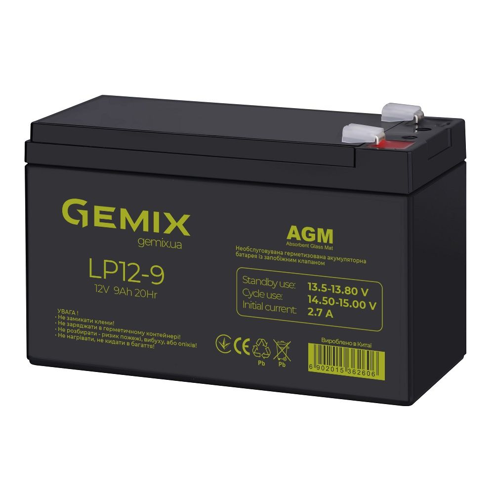 Свинцево-кислотна акумуляторна батарея Gemix LP12-9Ah. Скловолоконний абсорбуючий сепаратор (технологія AGM), вбирає електроліт і зменшує корозію електрода, ефективно збільшує термін служби і стійкість батарей. Батареї переносять перерозряд, перезаряд, вібрацію і удари, а також допускають тривале зберігання. Використання товстих і важких свинцево-кальцієвих пластин дозволяє досягти високої надійності роботи і довгого терміну служби батарей в режимах постійної підзарядки і циклічного використання.