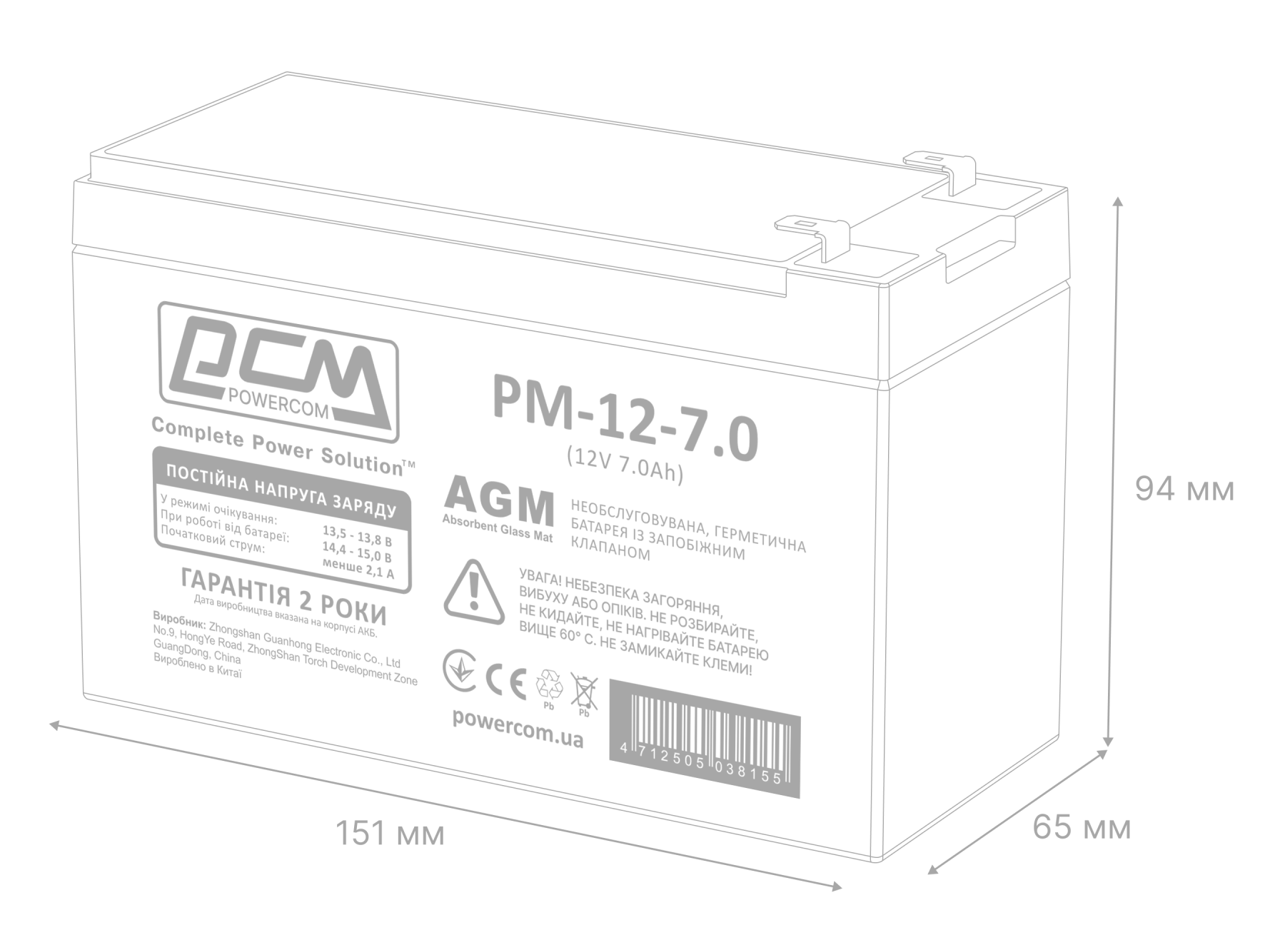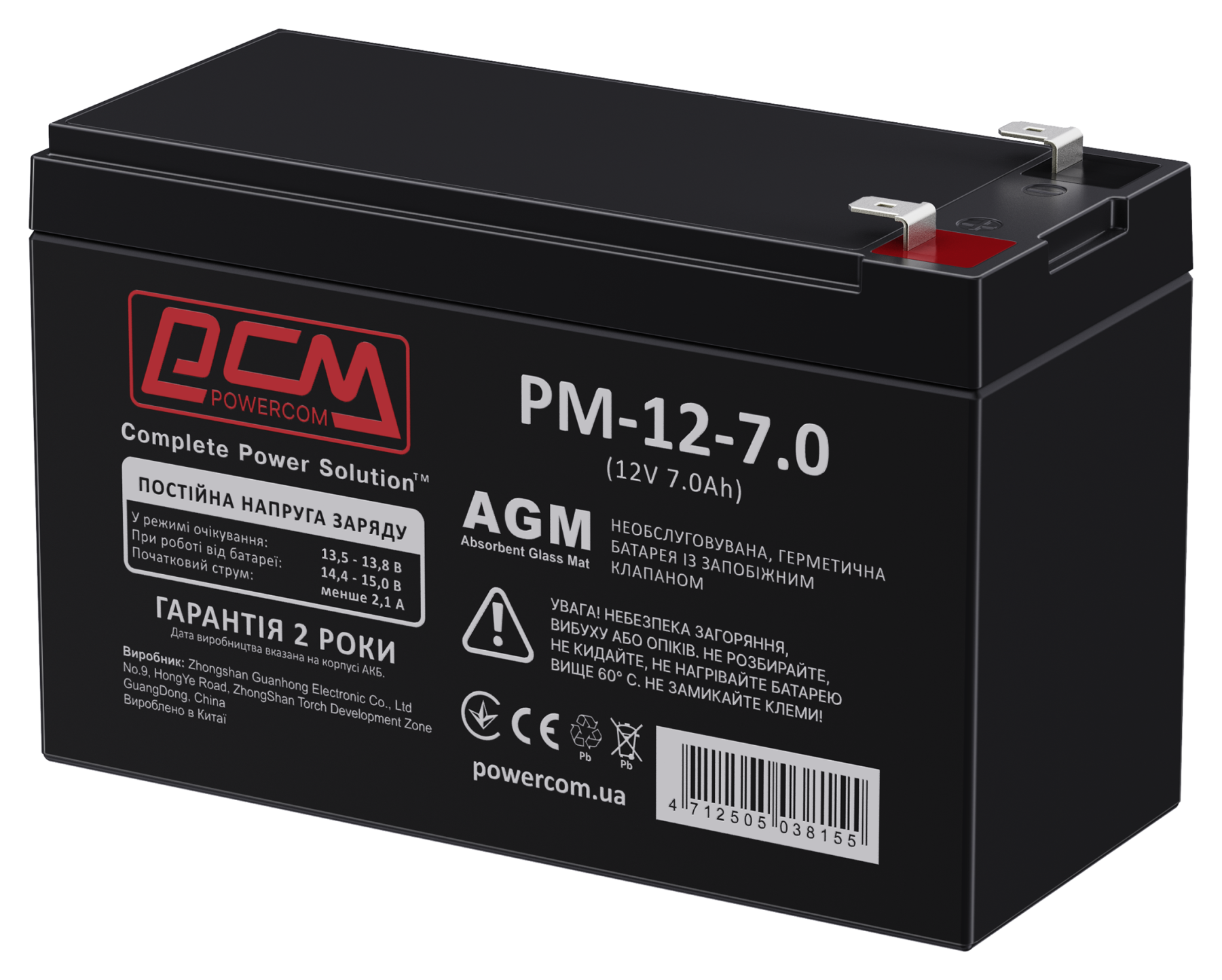 Powercom PM-12-7.0 — це свинцево-кислотний тип акумулятора. Виготовлений за AGM технологією (електроліт абсорбований у скловолоконному сепараторі).