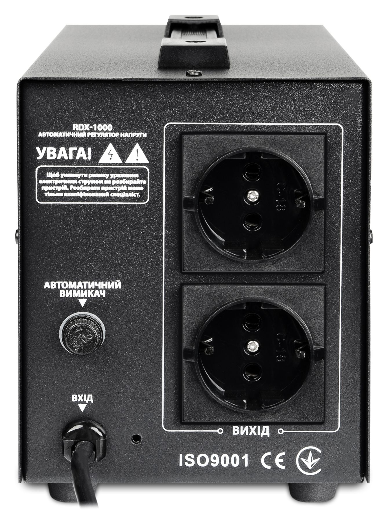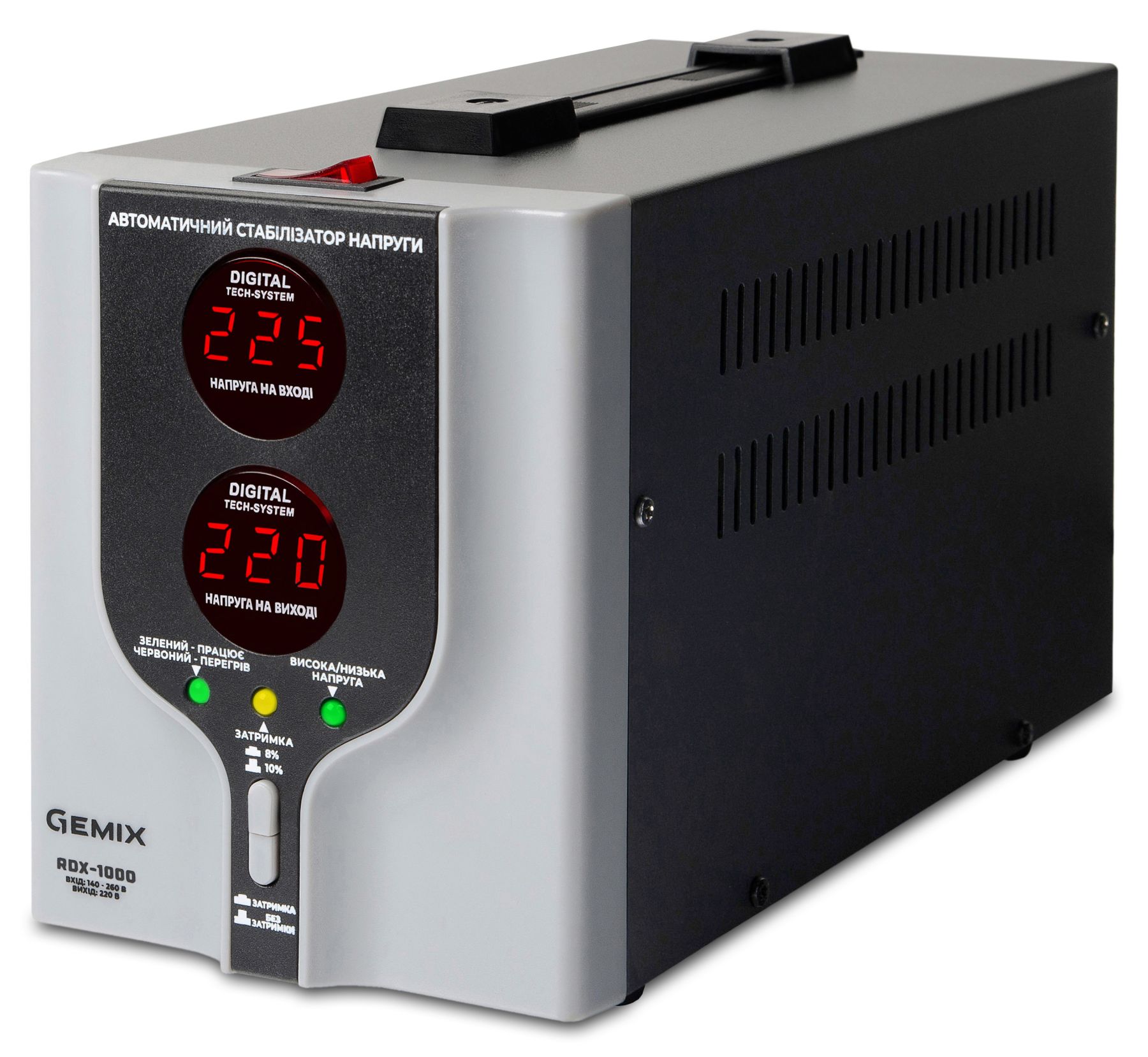 Стабілізатор напруги Gemix RDX-1000 Black - автоматичний стабілізатор напруги, однофазний, релейного типу. Призначений для забезпечення стабільного електроживлення та захисту побутового обладнання (електронасосів, комп'ютерів, телевізорів тощо) від нестабільної напруги в електромережі. Принцип дії полягає в автоматичному перемиканні секцій (обмоток) автотрансформатора за допомогою електромагнітних реле. Стабілізатор забезпечує вихідну напругу у вигляді чистої синусоїди, напруга на рівні 220 В з точністю ± 10%. Час передачі менше 0,5 сек. Час затримки виходу знаходиться в межах 6/120 сек.Захист від високої вихідної напруги спрацьовує при 255 В.